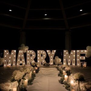 12ft long, 4ft tall- Marry Me bulb signage with candle and flowers on sides and pathway with red carpet or velvet fabric like pic,