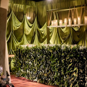 4 ft dia round table with heavy printed table cloth, 5 metal chivari chairs , small flower vase and 3 tea candles