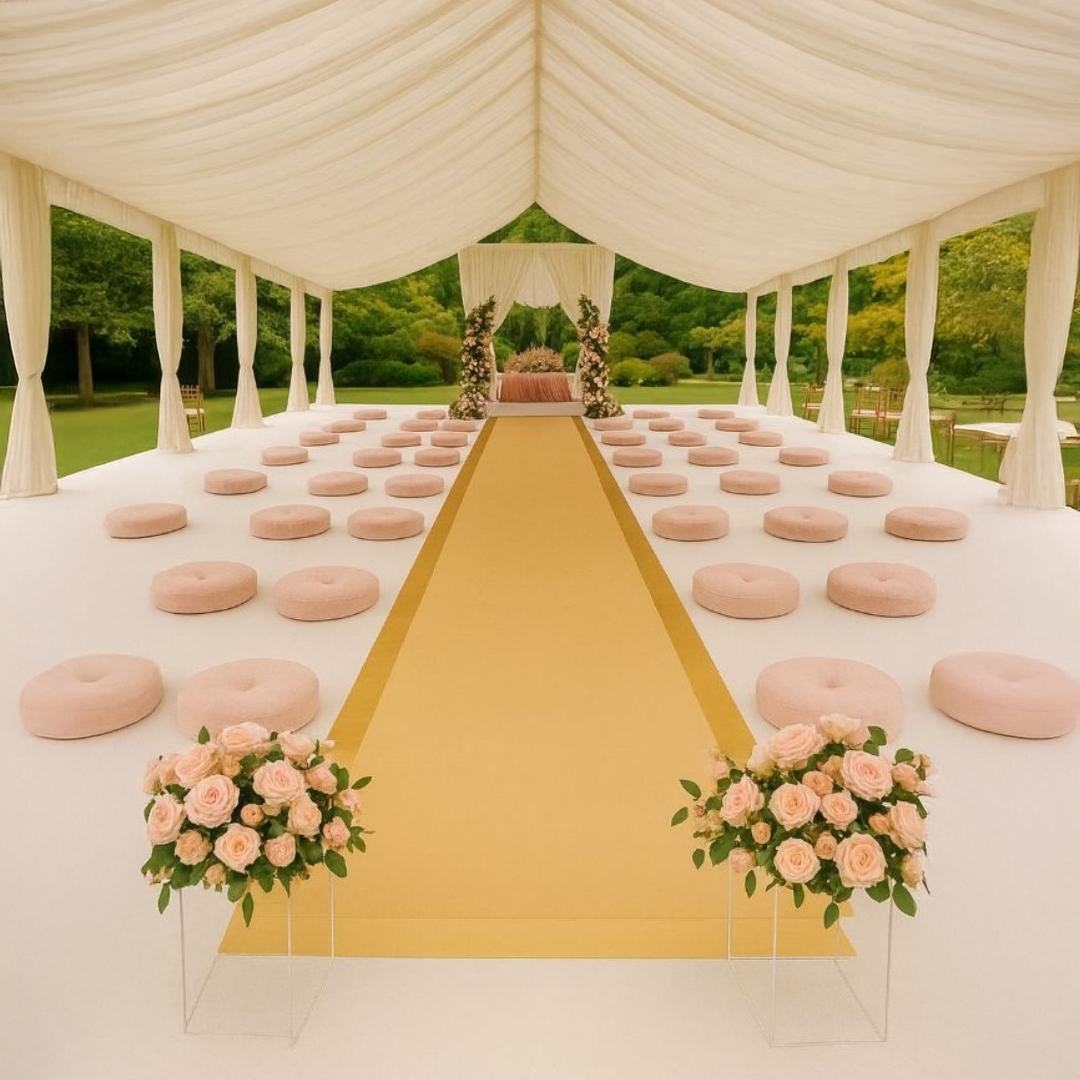 40x40ft structure at 15ft . Ivory drapes,Ivory carpet , seating of 50 pax in white matres. pastel mattress . 10x10ft baba ji beedh with riser and cover . Fresh Flowers on front 10ft , 4 bouquets